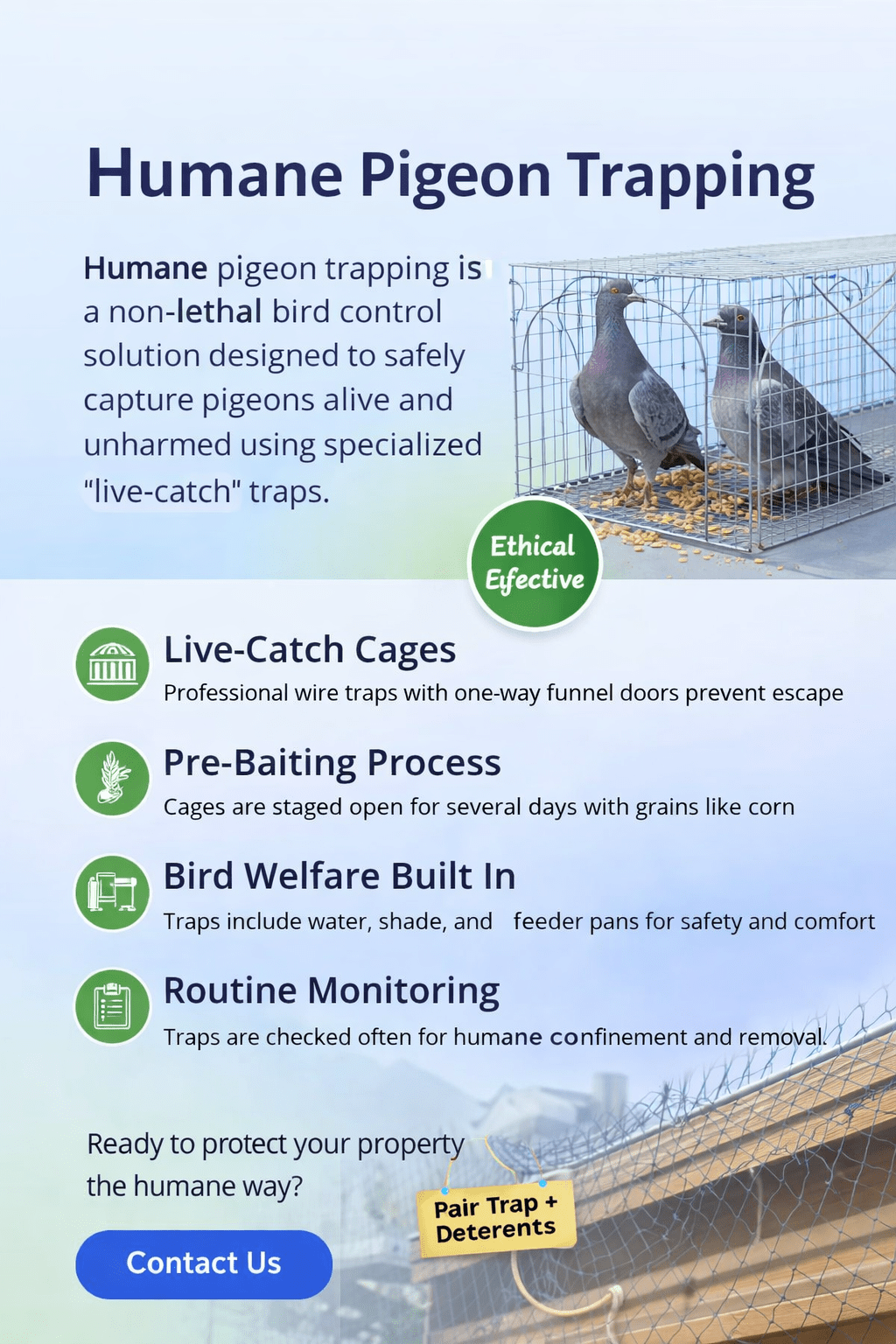 Humane pigeon trapping is a non-lethal bird control solution designed to safely capture pigeons alive and unharmed using specialized live-catch traps.